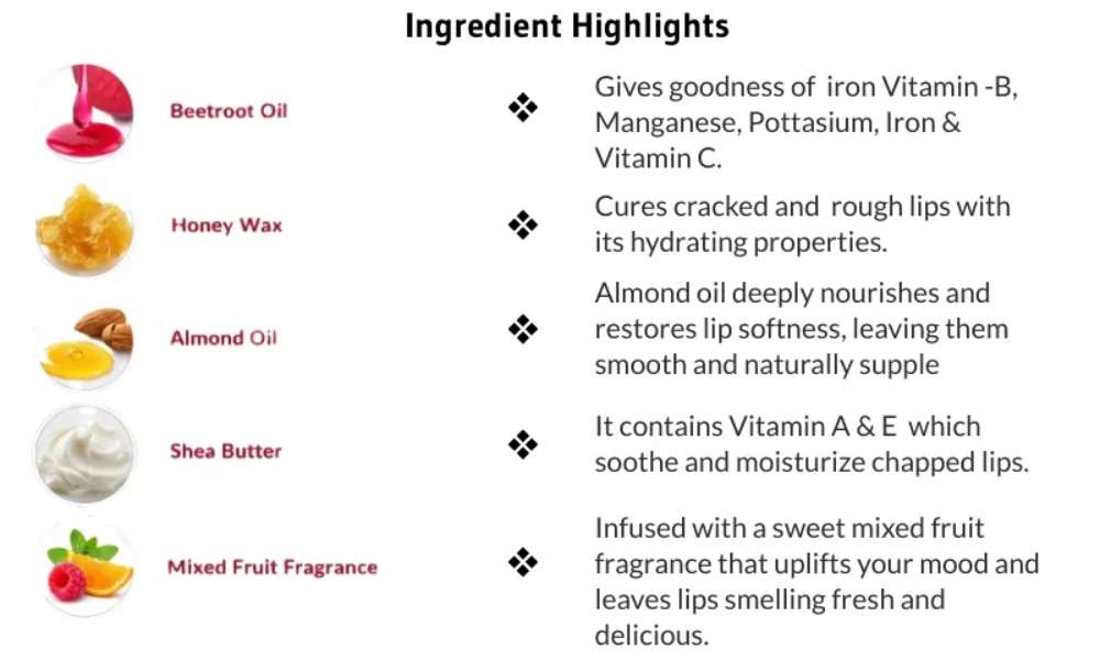 Formulated on the principles of Sneha Kalpana, this lip balm blends natural emollients and Ayurvedic oils to restore softness and colour to the lips. Beetroot oil, rich in natural pigments and antioxidants, helps lighten pigmentation and provides a gentle tint. Shea butter and almond oil deeply nourish and protect against dryness, while beeswax seals in moisture to prevent chapping. The subtle mixed fruit fragrance enhances the sensory experience, leaving lips supple and naturally radiant.
