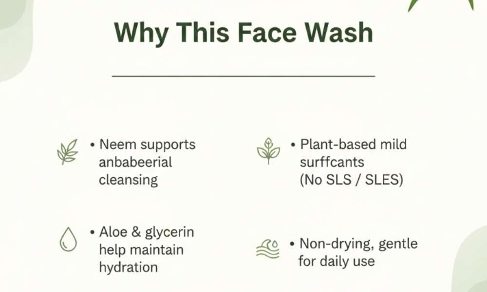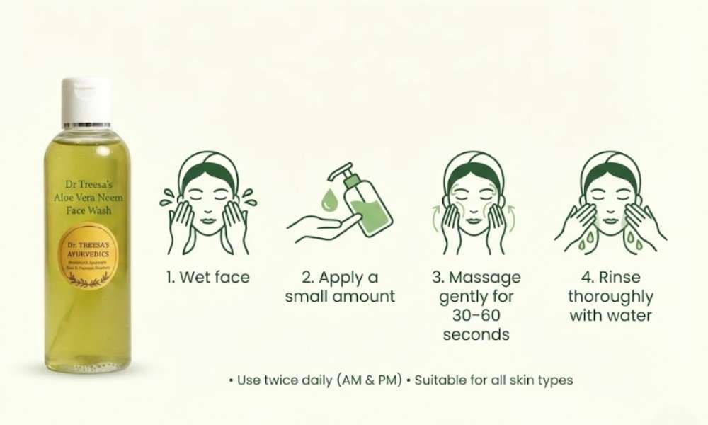 Dr Treesa’s Aloe Vera Neem Face Wash is a doctor-formulated herbal facial cleanser designed for gentle daily cleansing, while supporting acne control, hydration, and skin comfort. The formulation combines the purifying benefits of Neem with the soothing and hydrating properties of Aloe Vera, supported by a mild, plant-based cleansing base. It effectively removes dirt, excess oil, and environmental impurities without stripping the skin’s natural moisture. This face wash is suitable for regular use in varied climatic conditions, including environments that cause dryness or skin imbalance.