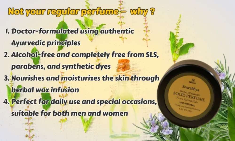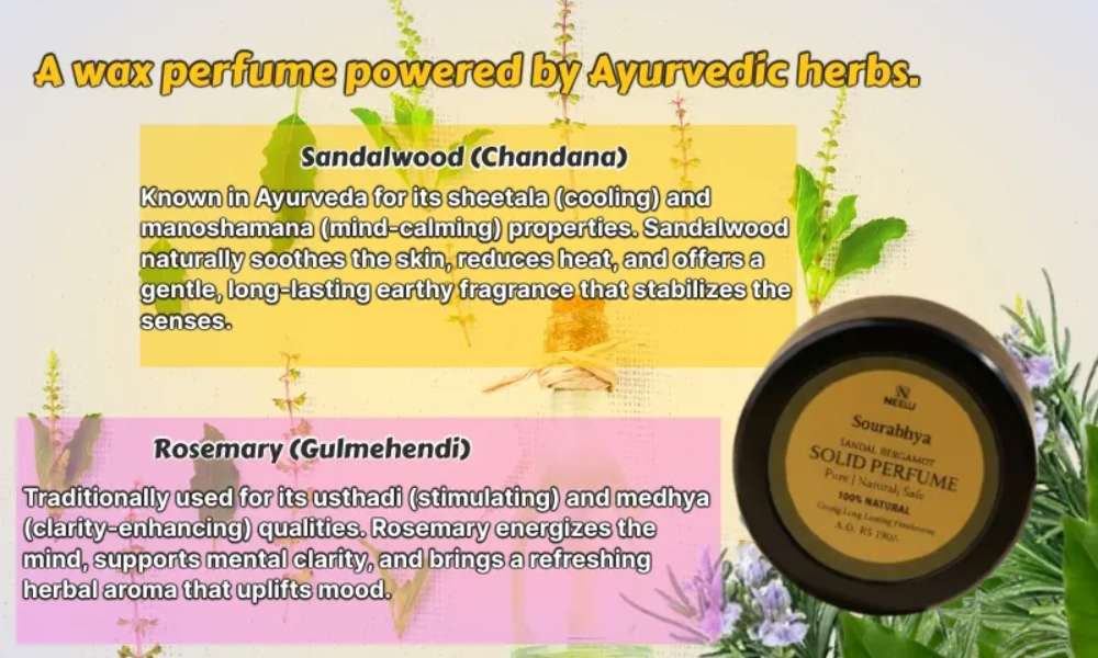 Sourabhya Wax Perfume is an Ayurvedic, alcohol-free solid perfume crafted by doctors using Sandalwood and Rosemary. This skin-friendly wax melts with body heat, delivering a long-lasting, calming yet refreshing aroma. Free from parabens, SLS, and dyes—perfect for daily wear and suitable for both men and women.